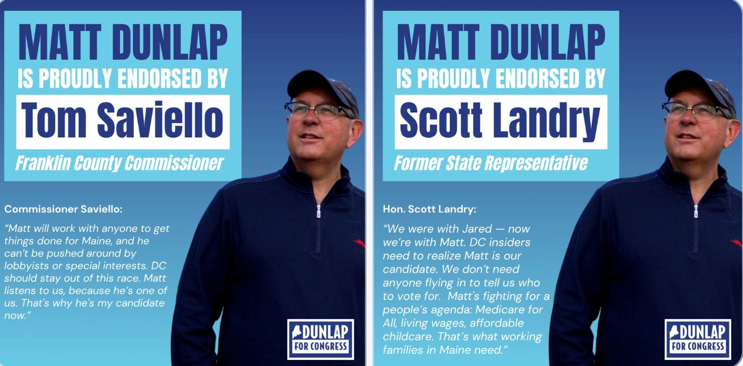 One is by Tom Saviello, a former Republican, who says “Matt will work with anyone to get things done with Maine.” The other is by a Democrat who talks about Dunlap’s commitment to living wages, universal health and affordable childcare. (Both tell DC folks to stay out of the race.)