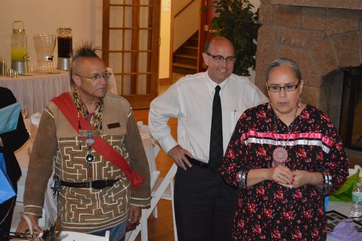 Members of the The Maine Wabanaki-State Child Welfare Truth & Reconciliation Commission discussed their experiences at a ceremony held in Hermon. They included (from left) gkisedtanamoogk, Matt Dunlap and Sandy White Hawk. Photo by Tom Keynolds of Maine- Wabanaki REACH, published by the Ellsworth American in June 2015.